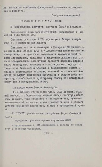 Основные резолюции конференции Глав государств и правительств Общей Афро-Малагасийской организации. Ниамей, 22-23 января 1968 г. Резолюция № 15. О национальном институте искусств (НИИ) в Абиджане