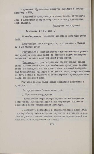 Основные резолюции конференции Глав государств и правительств Общей Афро-Малагасийской организации. Ниамей, 22-23 января 1968 г. Резолюция № 16. О необходимости совещания министров культуры стран ОКАМ