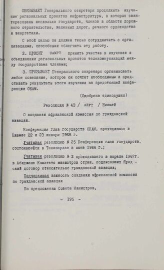 Основные резолюции конференции Глав государств и правительств Общей Афро-Малагасийской организации. Ниамей, 22-23 января 1968 г. Резолюция № 43. О создании африканской комиссии по гражданской авиации