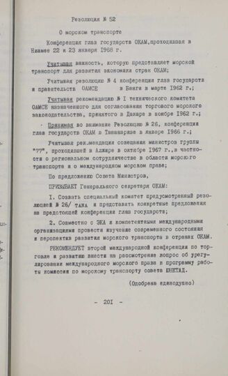Основные резолюции конференции Глав государств и правительств Общей Афро-Малагасийской организации. Ниамей, 22-23 января 1968 г. Резолюция № 52. О морском транспорте