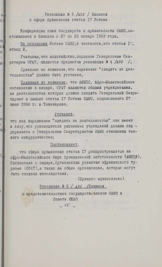 Резолюции конференции глав государств и правительств общей Афро-малагасийской организации. Киншаса, 27-29 января 1969 г. Резолюция № 5. О сфере применения статьи 17 Устава // Résolutions de la Conférence des Chef d'Etat et de Gouvernement de l'Organisation Commune Africaine et Malgache.