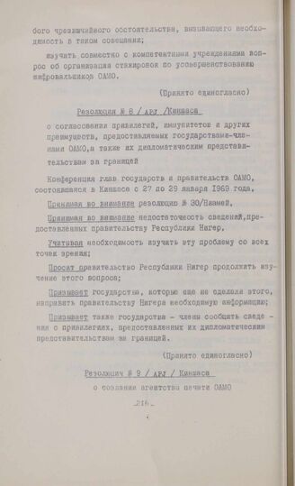 Резолюции конференции глав государств и правительств общей Афро-малагасийской организации. Киншаса, 27-29 января 1969 г. Резолюция № 8. О согласовании привилегий, иммунитетов и других преимуществ, предоставляемых государствами-членами ОАМО, а также их дипломатическим представительствам за границей // Résolutions de la Conférence des Chef d'Etat et de Gouvernement de l'Organisation Commune Africaine et Malgache.