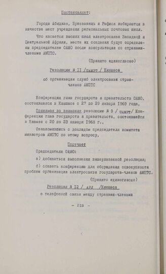 Резолюции конференции глав государств и правительств общей Афро-малагасийской организации. Киншаса, 27-29 января 1969 г. Резолюция № 12. О телефонной связи между странами-членами // Résolutions de la Conférence des Chef d'Etat et de Gouvernement de l'Organisation Commune Africaine et Malgache.