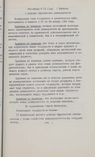 Резолюции конференции глав государств и правительств общей Афро-малагасийской организации. Киншаса, 27-29 января 1969 г. Резолюция № 15. О реформе африканских университетов // Résolutions de la Conférence des Chef d'Etat et de Gouvernement de l'Organisation Commune Africaine et Malgache.