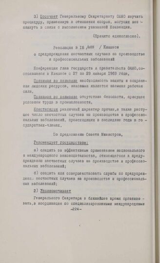 Резолюции конференции глав государств и правительств общей Афро-малагасийской организации. Киншаса, 27-29 января 1969 г. Резолюция № 18. О предупреждении несчастных случаев на производстве и профессиональных заболеваний // Résolutions de la Conférence des Chef d'Etat et de Gouvernement de l'Organisation Commune Africaine et Malgache.