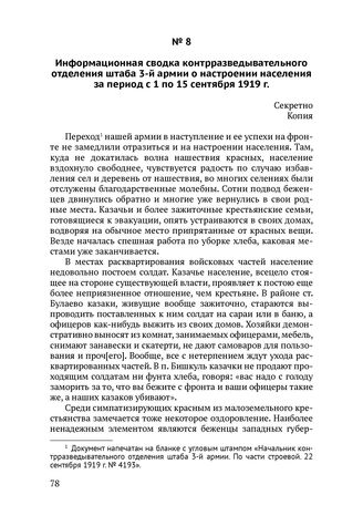 Информационная сводка контрразведывательного отделения штаба 3-й армии о настроении населения за период с 1 по 15 сентября 1919 г. // РГВА. Ф. 40218. Оп. 1. Д. 421. Л. 66-69. Заверенная копия. Машинопись.