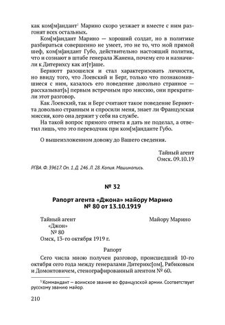Главная Фронт и тыл колчаковской армии в док. разведки июнь 1919-март 1920 Рапорт агента «Джона» майору Марино № 80 от 13.10.1919
