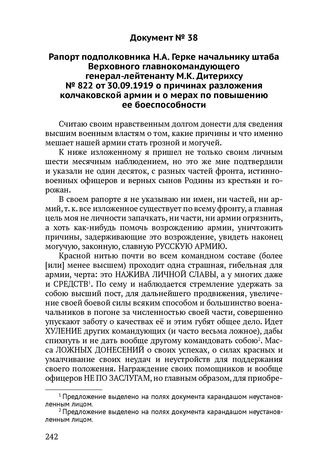 Рапорт подполковника Н.А. Герке начальнику штаба Верховного главнокомандующего генерал-лейтенанту М.К. Дитерихсу № 822 от 30.09.1919 о причинах разложения колчаковской армии и о мерах по повышению ее боеспособности // РГВА. Ф. 39483. Оп. 1. Д. 70. Л. 1-4. Заверенная копия. Машинопись.