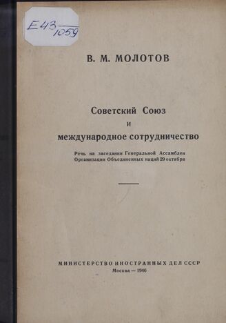 Молотов В.М. Советский Союз и международное сотрудничество. Речь на заседании Генеральной Ассамблеи Организации Объединенных наций 29 октября / М-во иностр. дел СССР. — М.: [Б. и.], 1946. — 28 с.