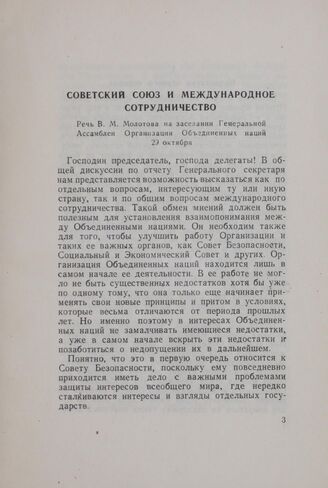 Молотов В.М. Советский Союз и международное сотрудничество. Речь на заседании Генеральной Ассамблеи Организации Объединенных наций 29 октября. — М., 1946.