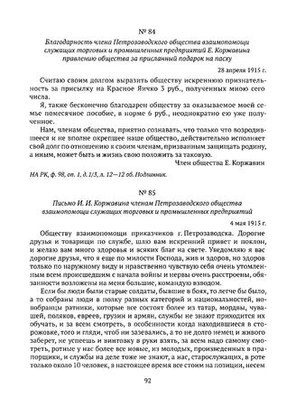 Письмо И.И. Коржавина членам Петрозаводского общества взаимопомощи служащих торговых и промышленных предприятий. 4 мая 1915 г. // НА РК, ф. 98, оп. 1, д. 1/3, л. 13-14 об. Подлинник.