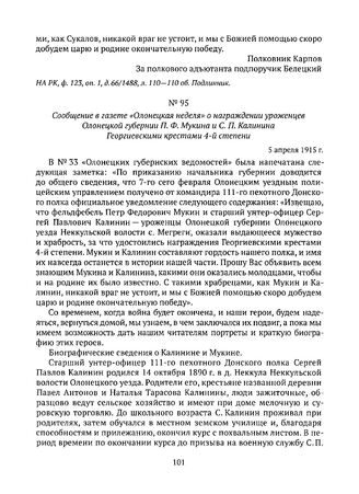Сообщение в газете «Олонецкая неделя» о награждении уроженцев Олонецкой губернии П.Ф. Мукина и С.П. Калинина Георгиевскими крестами 4-й степени. 5 апреля 1915 г. // Олонецкая неделя. 1915. 5 апреля.