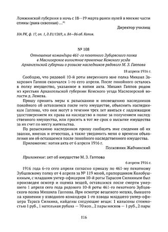 Отношение командира 461-го пехотного Зубцовского полка в Маслозерское волостное правление Кемского уезда Архангельской губернии о розыске наследников рядового М.З. Гаппова. 18 апреля 1916 г. // НА РК, ф. 176, оп. 1, д. 45/834, л. 43, 44. Подлинник.
