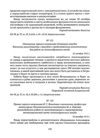Приказ горного начальника И.С. Яхонтова о назначении профессора металлургии Политехнического института М.А. Павлова руководителем работ по проектированию и переустройству металлургической части Александровского завода. 23 декабря 1915 г. // НА РК, ф. 37, оп. 29, д. 6/66, л. 155. Заверенная копия.