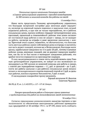 Отношение горного начальника Олонецких заводов в Главное артиллерийское управление с просьбой командировать до 300 человек из воинской команды для работы на заводе. 12 сентября 1916 г. // НА РК, ф. 37, оп. 1, д. 145/2575, л. 117-117 об. Отпуск.