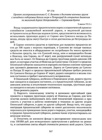 Проект лесопромышленника С.С. Беляева о доставке военных грузов с западного побережья Белого моря в Петроград до открытия движения по железной дороге Петрозаводск — Сорокская бухта. 3 июня 1915 г. // НА РК, ф. 1, оп. 1, д. 121/6, л. 394-395. Заверенная копия.