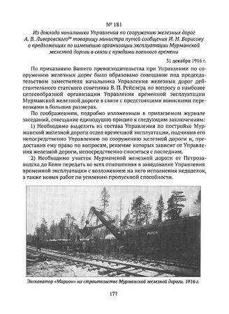 Из доклада начальника Управления по сооружению железных дорог А.В. Ливеровского товарищу министра путей сообщения И.Н. Борисову о предложениях по изменению организации эксплуатации Мурманской железной дороги в связи с нуждами военного времени. 31 декабря 1916 г. // НА РК, ф. 771, оп. 1, д. 1, л. 31-31 об. Заверенная копия.