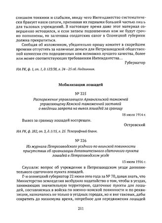 Распоряжение управляющего Архангельской таможней управляющему Кемской таможенной заставой о введении запрета на вывоз лошадей за границу. 18 июля 1914 г. // НА РК, ф. 282, оп. 3, д. 1/15, л. 25. Телеграфный бланк.