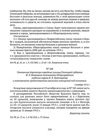 Отношение директора народных училищ Олонецкой губернии И.Л. Волковича попечителю Петроградского учебного округа Н.К. Кульчицкому о возможности предоставления школьных помещений под госпитали. 4 ноября 1914 г. // НА РК, ф. 17, оп. 1, д. 78/1222, л. 75. Копия.