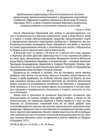Представление управляющего Кемской таможенной заставой управляющему Архангельской таможней о прекращении пароходного сообщения с Мурманом и рыбного промысла в Белом море до начала навигации 1915 г. в связи с началом военных действий и разрешении поморам-рыбакам не оплачивать пошлину за свои суда. 7 августа 1914 г. // НА РК, ф. 282, оп. 1, д. 25/231, л. 39-40. Копия.