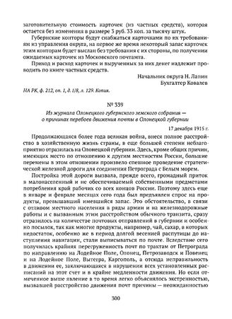 Из журнала Олонецкого губернского земского собрания — о причинах перебоев движения почты в Олонецкой губернии. 17 декабря 1915 г. // Журналы Олонецкого губернского земского собрания сессий чрезвычайной 16 августа и 49-й очередной 2-19 декабря 1915 года. Петрозаводск, 1916. С. 193-195.