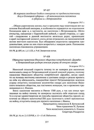 Обращение правления Ивинского общества потребителей «Дружба» в Петрозаводскую уездную земскую управу об отпуске сахара. 24 апреля 1917 г. // НА РК, ф. 14, оп. 2, д. 53/958, л. 11-11 об. Подлинник.
