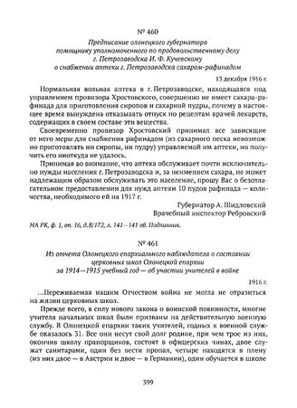 Из отчета Олонецкого епархиального наблюдателя о состоянии церковных школ Олонецкой епархии за 1914-1915 учебный год — об участии учителей в войне. 1916 г. // Олонецкие епархиальные ведомости. 1916. С. 58.