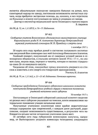 Сообщение учителя Волосовского одноклассного министерского училища Каргопольского уезда Н.Н. Агапитова директору Петрозаводской мужской учительской семинарии М.Н. Правдину о смерти сына. 1 сентября 1917 г. // НА РК, ф. 79, оп. 1, д. 14/2, л. 21-21 об. Подлинник. Почтовая карточка.