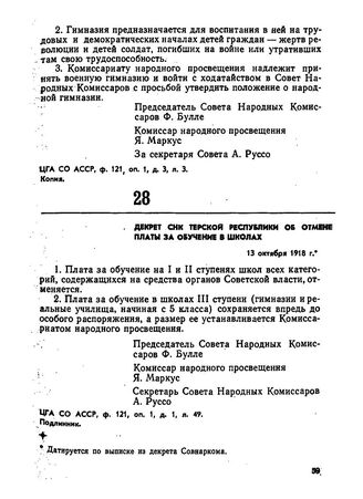 Декрет СНК Терской республики об отмене платы за обучение в школах. 13 октября 1918 г.
