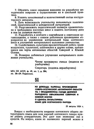 Из доклада наркома просвещения Северо-Осетинской автономной области на I объединенном съезде деятелей народного образования Северной и Южной Осетии о едином литературном языке для осетинского народа. 23 августа 1924 г. // ЦГА СО АССР, ф. 49, оп. 1, д. 584, л. 27. Подлинник.