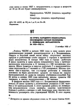 Из отчета Народного комиссариата просвещения Горской республики о ликвидации неграмотности за 1922-1923 гг. 2 октября 1923 г. // ЦГА СО АССР, ф. 123, оп. 1, д. 48, лл. 18 об., 19. Копия.