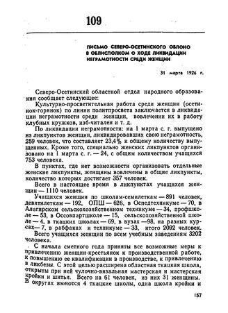 Письмо Северо-Осетинского облоно в облисполком о ходе ликвидации неграмотности среди женщин. 31 марта 1926 г.