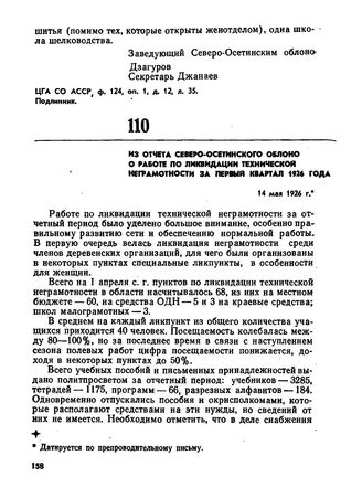 Из отчета Северо-Осетинского облоно о работе по ликвидации технической неграмотности за первый квартал 1926 года. 14 мая 1926 г. // ЦГА СО АССР, ф. 124, оп. 1, д. 24, л. 66. Подлинник.