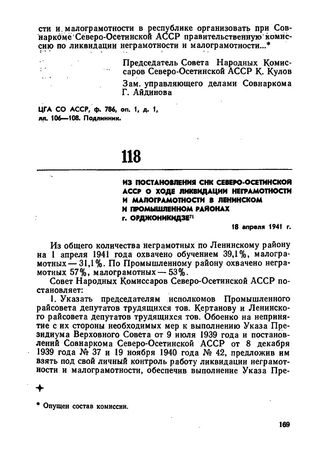 Из постановления СНК Северо-Осетинской АССР о ходе ликвидации неграмотности и малограмотности в Ленинском и Промышленном районах г. Орджоникидзе. 18 апреля 1941 г.