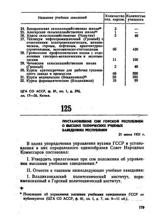 Постановление СНК Горской республики о высших технических учебных заведениях. 21 июня 1921 г.