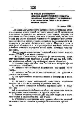 Из письма Осетинского историко-филологического общества Народному комиссариату просвещения РСФСР об отпуске средств на издание научных трудов. 26 января 1922 г.