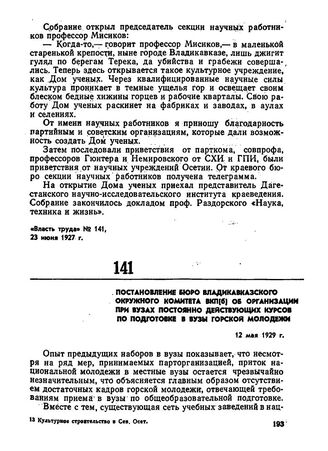 Постановление бюро Владикавказского окружного комитета ВКП(б) об организации при вузах постоянно действующих курсов по подготовке в вузы горской молодежи. 12 мая 1929 г.