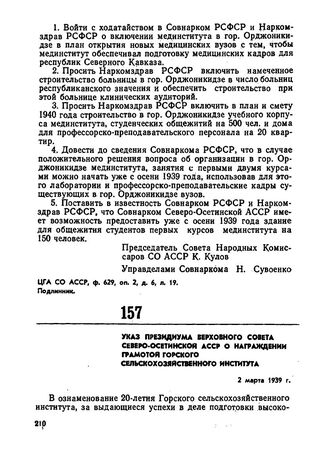 Указ Президиума Верховного Совета Северо-Осетинской АССР о награждении Грамотой Горского сельскохозяйственного института. 2 марта 1939 г.