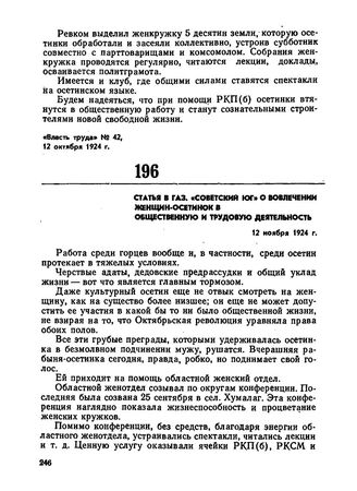 Статья в газ. «Советский Юг» о вовлечении женщин-осетинок в общественную и трудовую деятельность. 12 ноября 1924 г. // «Советский Юг» № 258 (1756), 12 ноября 1924 г.