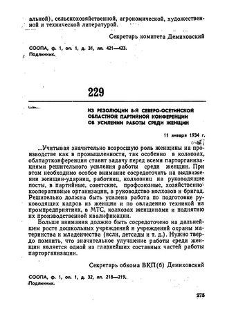 Из резолюции 8-й Северо-Осетинской областной партийной конференции об усилении работы среди женщин. 11 января 1934 г. // СООПА, ф. 1, оп. 1, д. 32, лл. 218-219. Подлинник.