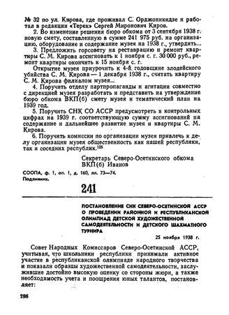 Постановление СНК Северо-Осетинской АССР о проведении районной и республиканской олимпиад детской художественной самодеятельности и детского шахматного турнира. 25 ноября 1938 г.