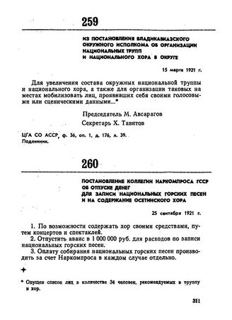 Постановление коллегии Наркомпроса ГССР об отпуске денег для записи национальных горских песен и на содержание осетинского хора. 25 сентября 1921 г. // ЦГА СО АССР, ф. 41, оп. 1, д. 74, л. 25. Заверенная копия.