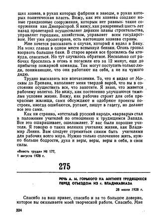 Речь А.М. Горького на митинге трудящихся перед отъездом из г. Владикавказа. 28 июля 1928 г. // «Власть труда» № 178, 2 августа 1928 г.