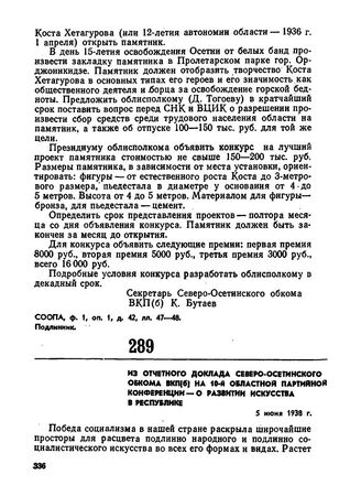 Из отчетного доклада Северо-Осетинского обкома ВКП(б) на 10-й областной партийной конференции — о развитии искусства в республике. 5 июня 1938 г. // СООПА, ф. 1, оп. 1, д. 149, лл. 69-70. Подлинник.