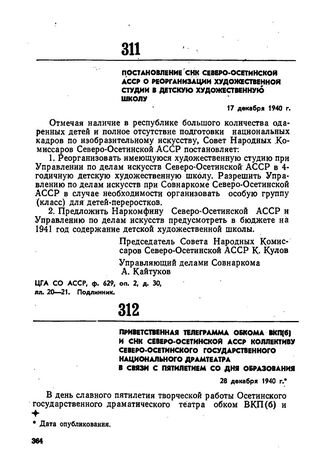 Приветственная телеграмма обкома ВКП(б) и СНК Северо-Осетинской АССР коллективу Северо-Осетинского государственного национального драмтеатра в связи с 5-летием со дня образования. 28 декабря 1940 г. // «Социалистическая Осетия» № 301, 28 декабря 1940 г.