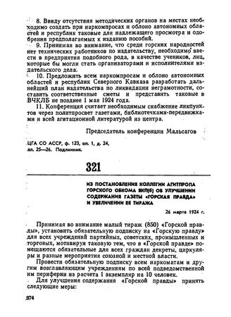 Из постановления коллегии агитпропа Горского обкома ВКП(б) об улучшении содержания газеты «Горская правда» и увеличении ее тиража. 26 марта 1924 г. // СООПА, ф. 204, оп. 1, д. 48, л. 56. Подлинник.