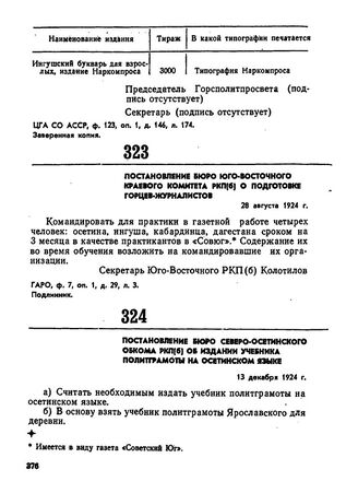 Постановление бюро Северо-Осетинского обкома РКП(б) об издании учебника политграмоты на осетинском языке. 13 декабря 1924 г.
