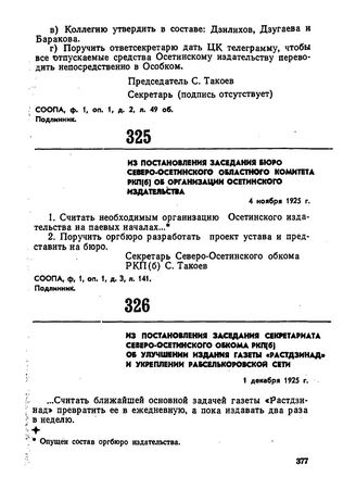 Из постановления заседания бюро Северо-Осетинского областного комитета РКП(б) об организации осетинского издательства. 4 ноября 1925 г.