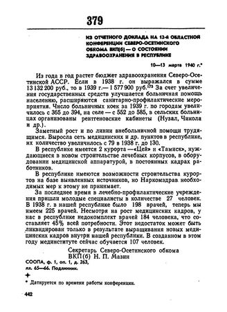 Из отчетного доклада на 12-й областной партийной конференции Северо-Осетинского обкома ВКП(б) — о состоянии здравоохранения в республике. 10-13 марта 1940 г.