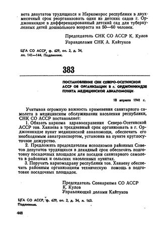 Постановление СНК Северо-Осетинской ACCP об организации в г. Орджоникидзе пункта медицинской авиапомощи. 18 апреля 1941 г. // ЦГА СО АССР, ф. 629, оп. 2, д. 34, л. 163. Подлинник.